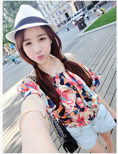 新款夏裝.油畫花朵露肩一字領(lǐng)短款上衣 /