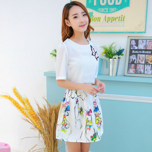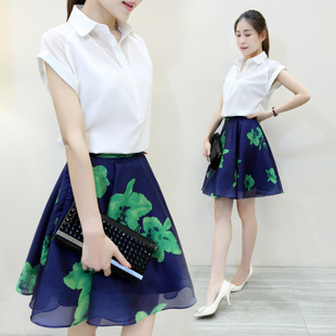 2015新款時尚套裝連衣裙小香風印花雪紡衫半身裙休閑套裝裙 /