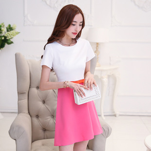 2015夏新款韓版打底甜美蝴蝶結(jié)撞色圓領(lǐng)短袖修身顯瘦連衣裙女 /