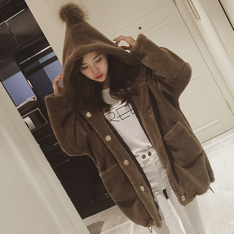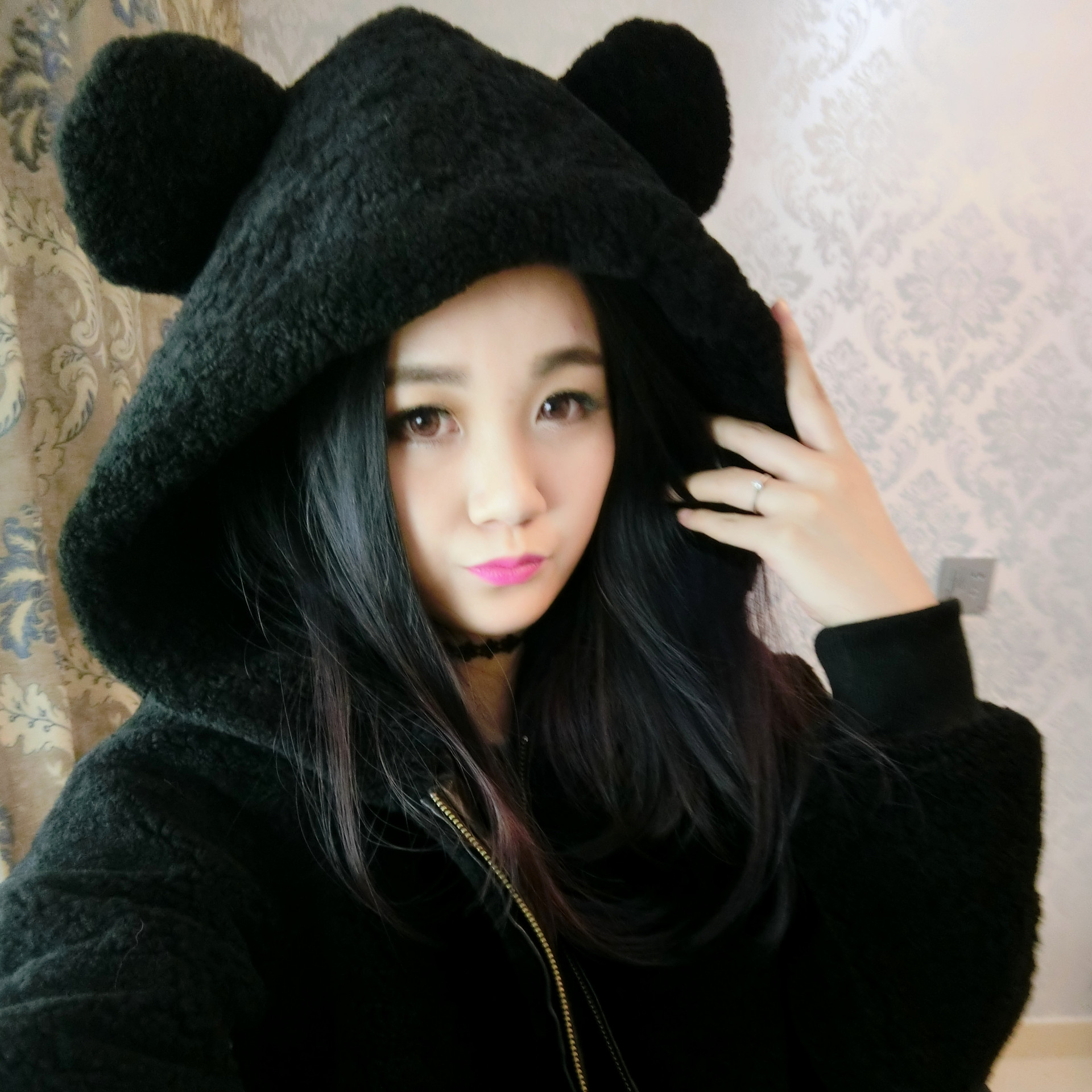 羊羔毛小熊耳朵美利奴羊毛女外套羊剪絨皮毛一體皮草短款連帽帶帽 /