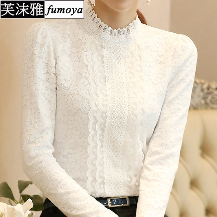 2015冬裝新款長袖立領(lǐng)大碼女裝打底衫韓版時尚加絨加厚蕾絲衫 /