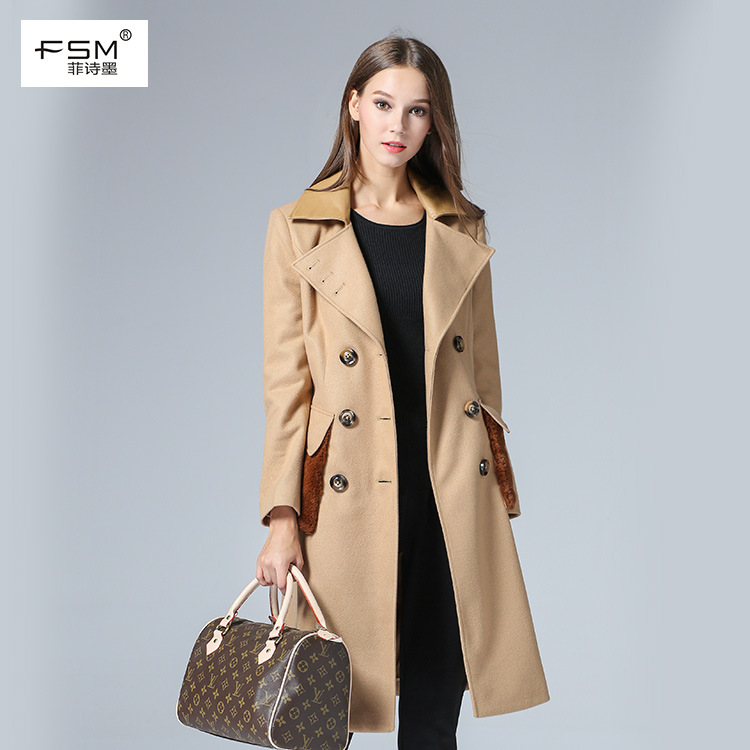 歐洲站毛皮裝飾口袋翻領(lǐng)毛呢大衣 中長(zhǎng)寬修身女士風(fēng)衣外套 /