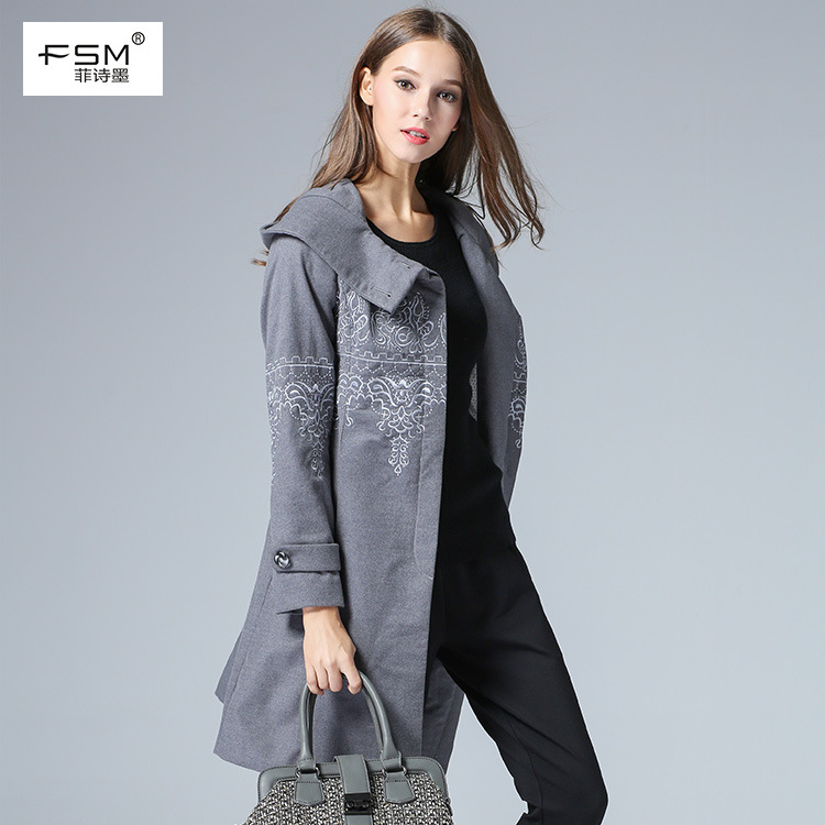 簡(jiǎn)介: 貨號(hào)QZH15030# 產(chǎn)地深圳 品牌菲詩(shī)墨 主圖來源實(shí)拍有模特 產(chǎn)品類別風(fēng)衣 貨源類別訂貨 最快出貨時(shí)間1-3天 面料名稱毛呢面料 主面料成分錦綸/尼龍 主面料成分的含量50(%) 圖案繡花精細(xì) 風(fēng)格歐美 厚薄普通 版型裙擺型 衣長(zhǎng)中長(zhǎng)款(65cm<衣長(zhǎng)≤80cm) 領(lǐng)型連帽/帽領(lǐng) 袖長(zhǎng)長(zhǎng)袖 衣門襟單排扣 是否有腰帶無腰帶 流行元素刺繡