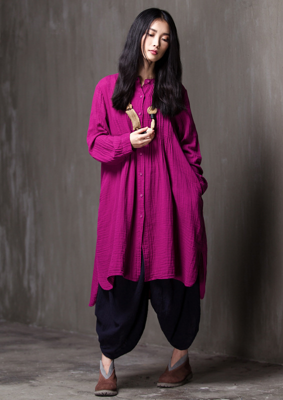 2015秋款 褶皺工藝純色素棉麻小立領(lǐng)長款開衫 文藝女神女士襯衫 /