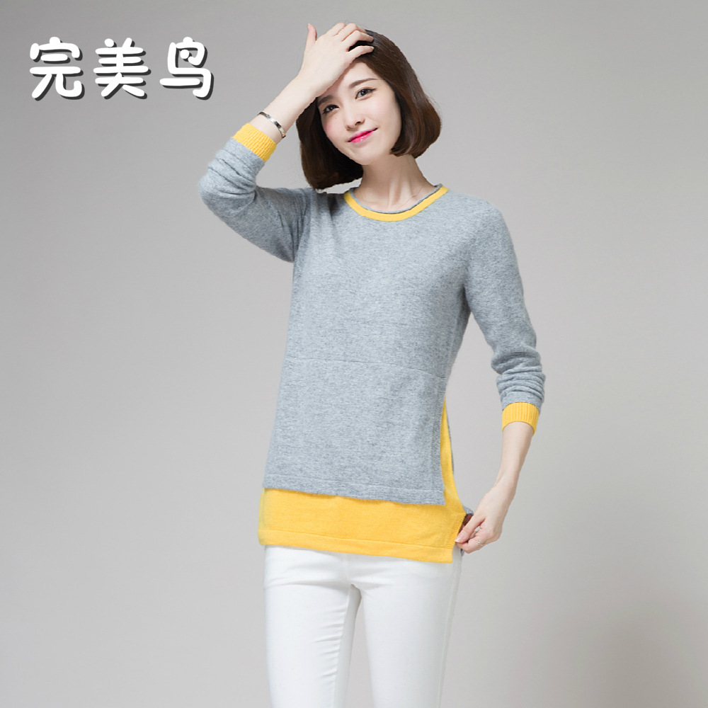完美鳥2015秋冬新款女裝毛衣貂絨針織衫套頭撞色休閑貂絨毛衣女 /