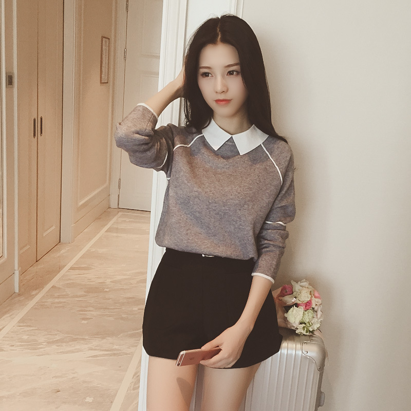 韓國代購冬季新款女式娃娃領(lǐng)套頭修身針織衫 拼色長袖打底毛衣 女 /