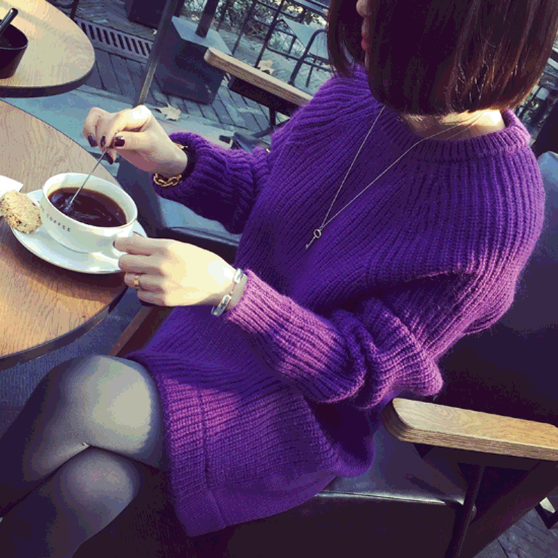 2015秋冬新款韓版毛衣女套頭中長款寬松純色圓領(lǐng)針織衫加厚女批發(fā) /