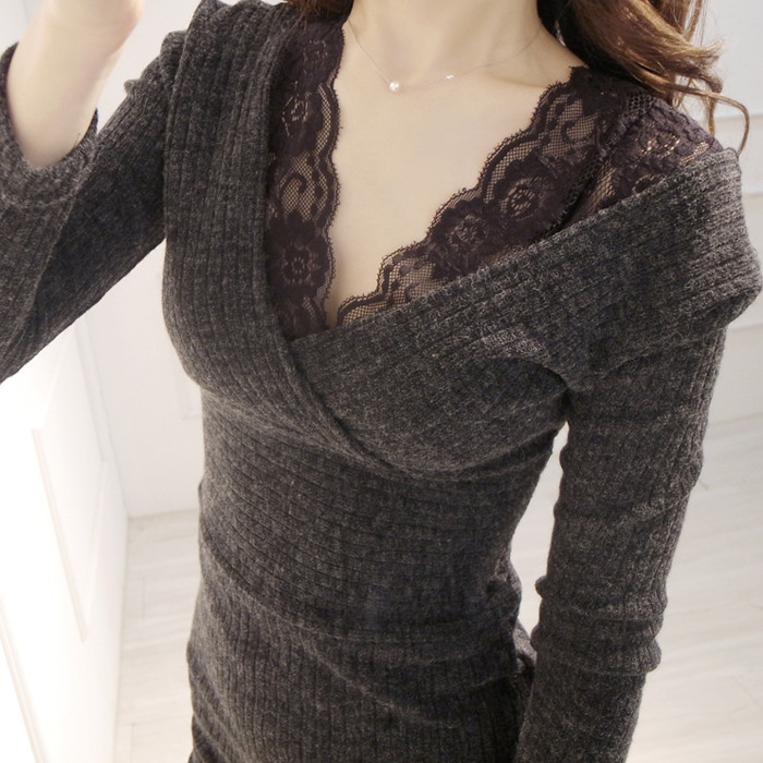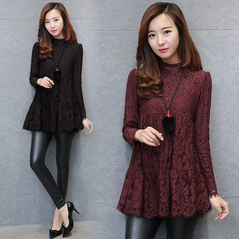 加絨加厚中長(zhǎng)款蕾絲打底衫女2015秋冬新款拼皮裙擺蕾絲小衫潮上衣 /