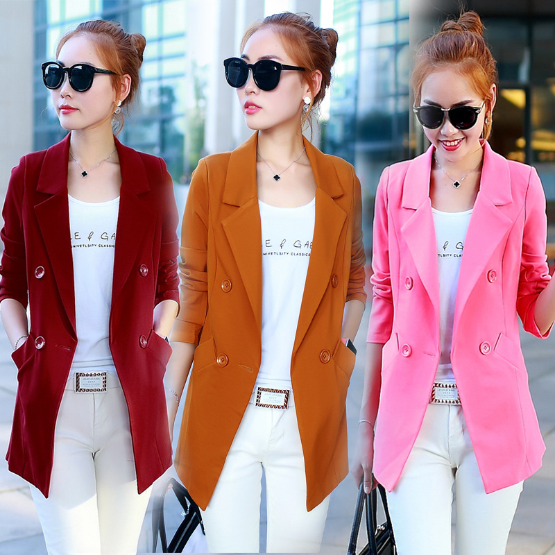 2015新款秋裝女外套 韓版純色中長款雙排扣西裝品牌女裝代理加盟 /