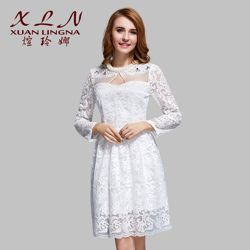 廠家直銷2015時尚連衣裙白色蕾絲花邊裙秋冬款加絨釘珠 /
