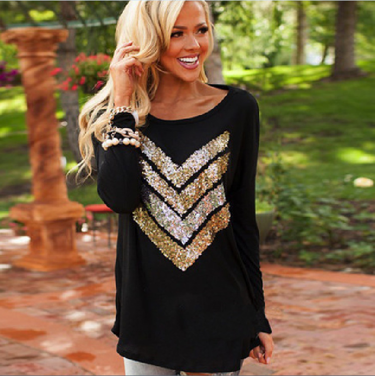外貿(mào)速賣通 歐美箭頭亮片黑色中長款長袖女士t恤 打底衫 秋季新款 /