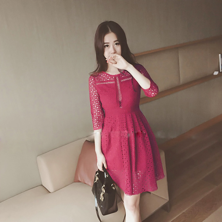 韓版圓領優(yōu)質(zhì)水溶花圓孔鏤空透視中袖連衣裙 工廠直銷商場貨色 /