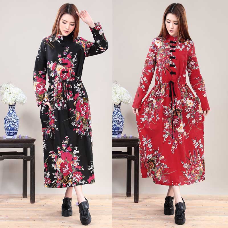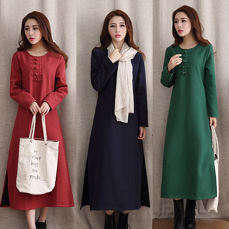 2015復(fù)古文藝秋冬中國風(fēng)棉麻加絨盤扣連衣裙寬松長袖氣質(zhì)超長裙子 /