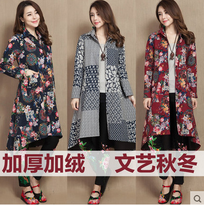 2015秋冬季民族風(fēng)加絨加厚女裝時(shí)尚棉麻印花襯衫中長款外套 /
