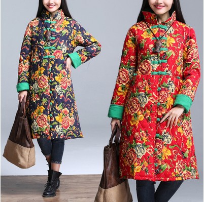2015民族風(fēng)女裝長款盤扣棉衣女棉麻印花中式復(fù)古秋冬裝棉襖 /