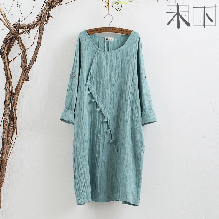 原創(chuàng)手工盤扣亞麻連衣裙 秋款長袖圓領(lǐng)長裙袍子 精致中式中長裙 /