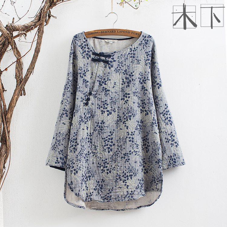 中式復(fù)古盤扣上衣 寬松長袖撞色青花襯衣 顯瘦女文藝范短棉麻上衣 /