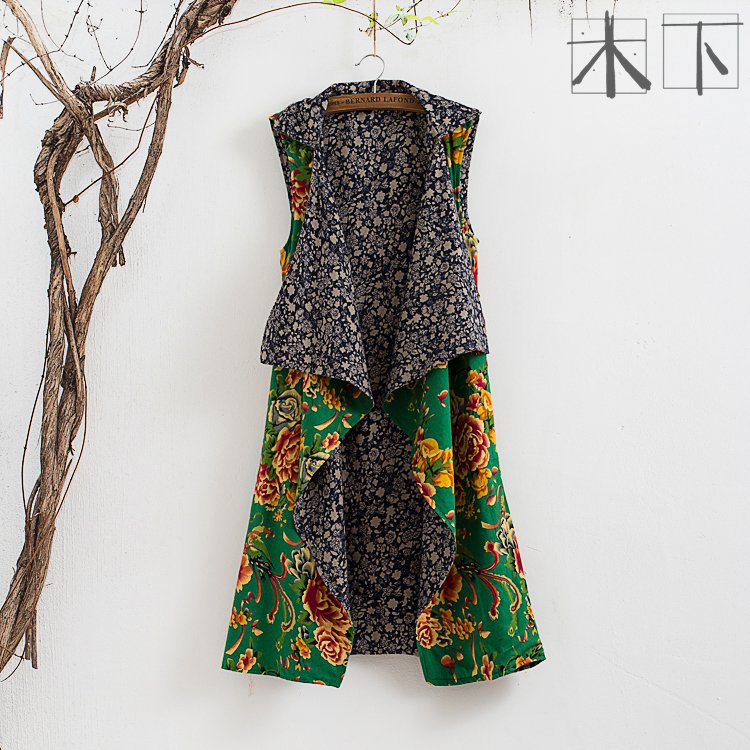 秋新款 原創(chuàng)民族風(fēng)印花馬甲 不規(guī)則亞麻背心 撞色東北大花長馬甲 /