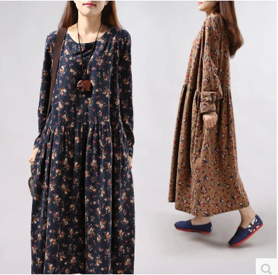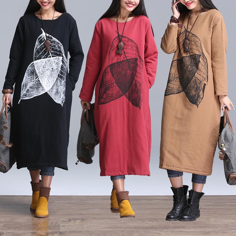 2015文藝女裝葉子印花大碼加棉加厚長袍子長袖圓領(lǐng)套頭棉麻連衣裙 /