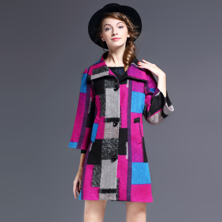 桑倪2015冬季新款女裝 歐美翻領(lǐng)格子印花修身加厚羊毛毛呢外套 /