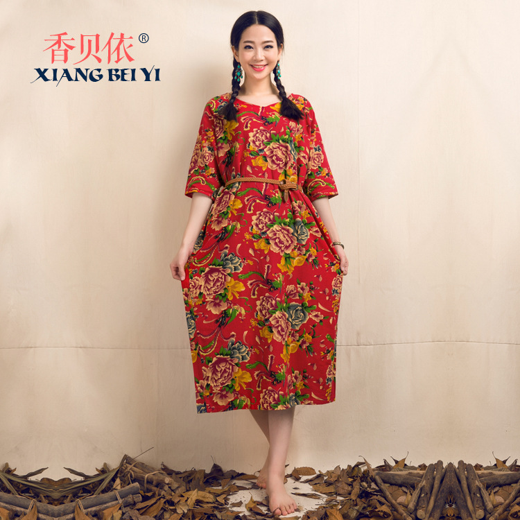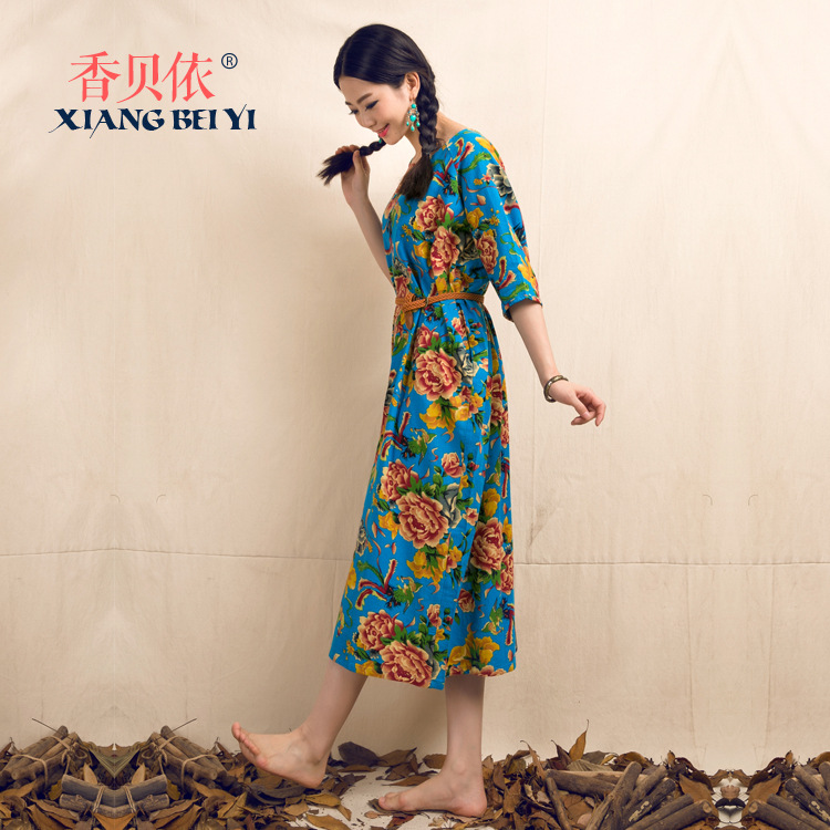 2015秋冬新款中袖裙子棉麻連衣裙 民族風印花中長款 一件代發(fā) /