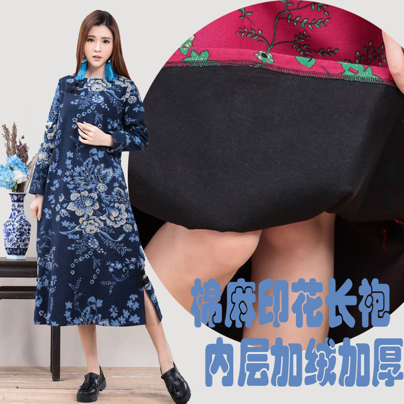 實拍民族風印花大碼長袖棉麻冬裝加絨連衣裙中國風盤扣開叉裙子 /