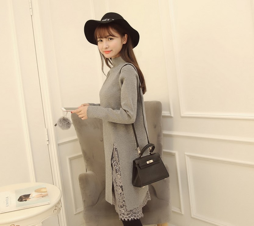 秋冬新款蕾絲拼接開叉中長(zhǎng)款打底針織衫女毛衣顯瘦連衣裙 /
