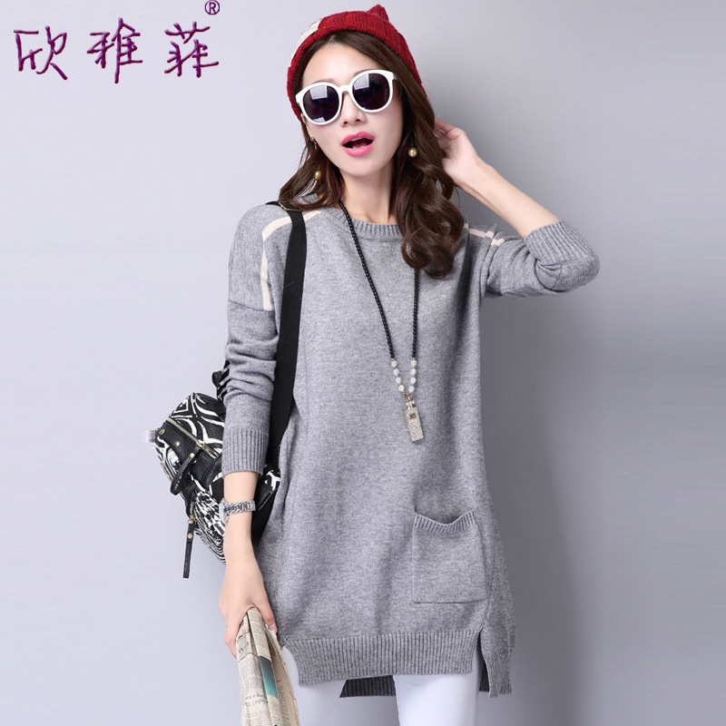 2015秋裝新款韓版下擺開叉圓領寬松套頭針織衫中長款長袖毛衣女爆 /