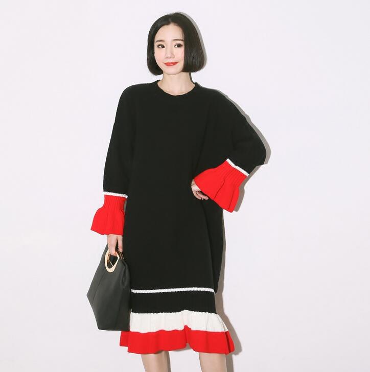 韓版圓領(lǐng)針織長(zhǎng)袖下擺百褶連衣裙女秋冬新款 /
