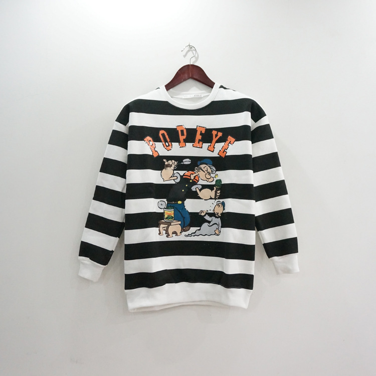 秋冬新款韓版條紋卡通印花加厚寬松大碼中長款休閑加絨套頭衛(wèi)衣女 /