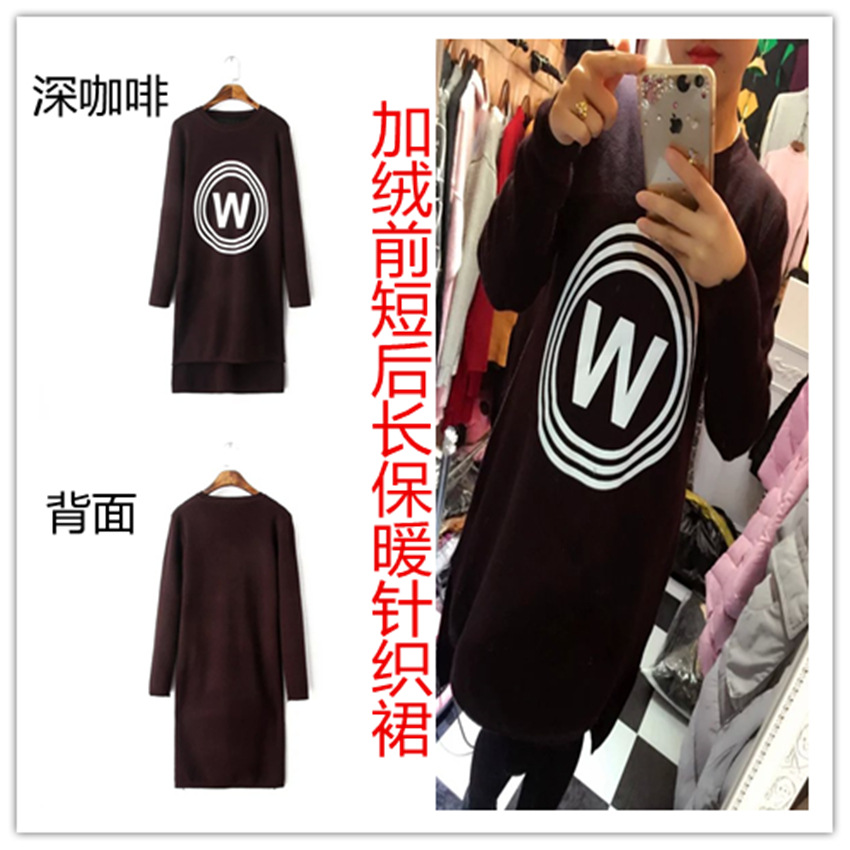 12.12.4廠家直銷加絨休閑圓領女款套頭針織裙加厚前短后長字母W冬 /