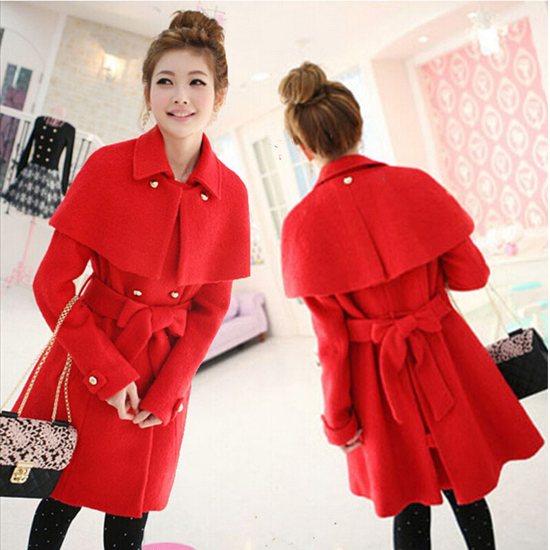 冬天外套韓版中長款女裝結(jié)婚禮服斗篷披肩紅色毛呢子大衣時尚修身 /