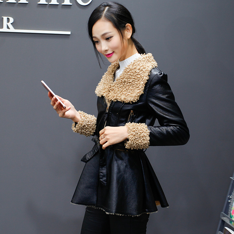 2015冬裝新款韓版中長款修身顯瘦毛領(lǐng)加絨加厚長袖pu皮衣外套女裝 /