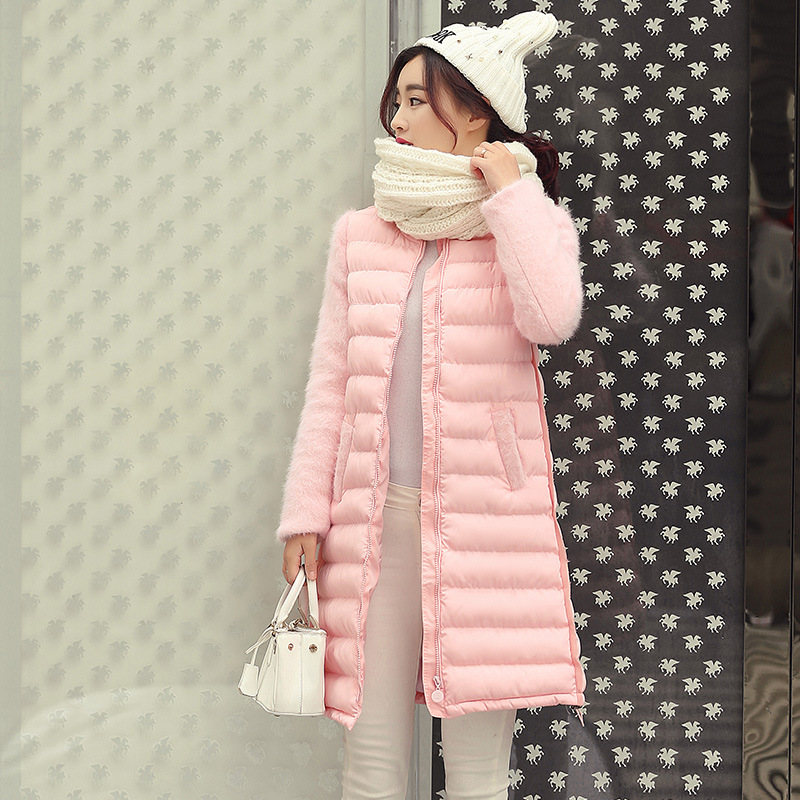 女裝棉衣2015冬裝新款水貂毛袖子拼接加厚修身中長款羽絨棉棉服 /