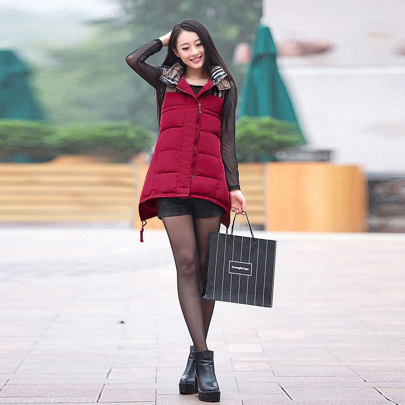 2015冬季新款時(shí)尚毛領(lǐng)連帽純色拉鏈氣質(zhì)中長(zhǎng)款女士修身韓版馬甲 /