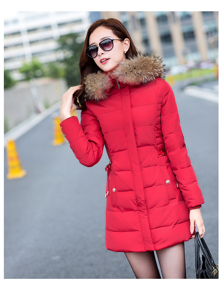 2015韓版修身時(shí)尚可拆卸大毛領(lǐng)中長款連帽羽絨服 女裝 100%白鴨絨 /