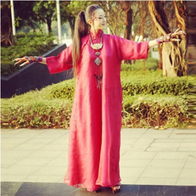 獨家原創(chuàng)楊麗萍同款文藝復(fù)古改良真絲旗袍連衣裙歐根紗雙層長袍 /