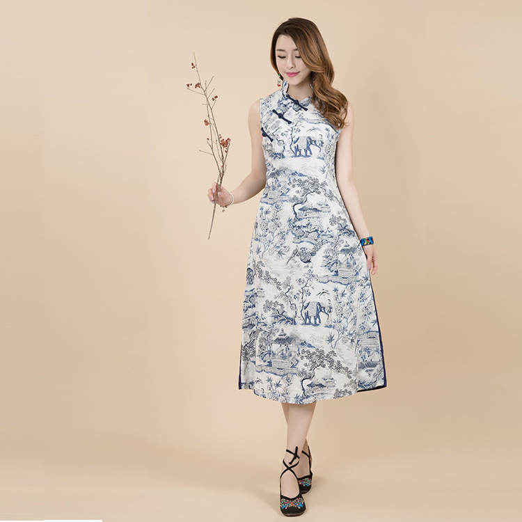 新款文藝日系棉麻連衣裙改良復(fù)古修身民族風(fēng)印花時尚開叉旗袍 /
