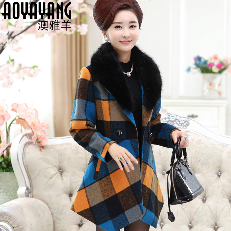2015冬季新款中老年媽媽裝中長款毛領(lǐng)厚款毛呢風(fēng)衣大衣羊毛大衣女 /