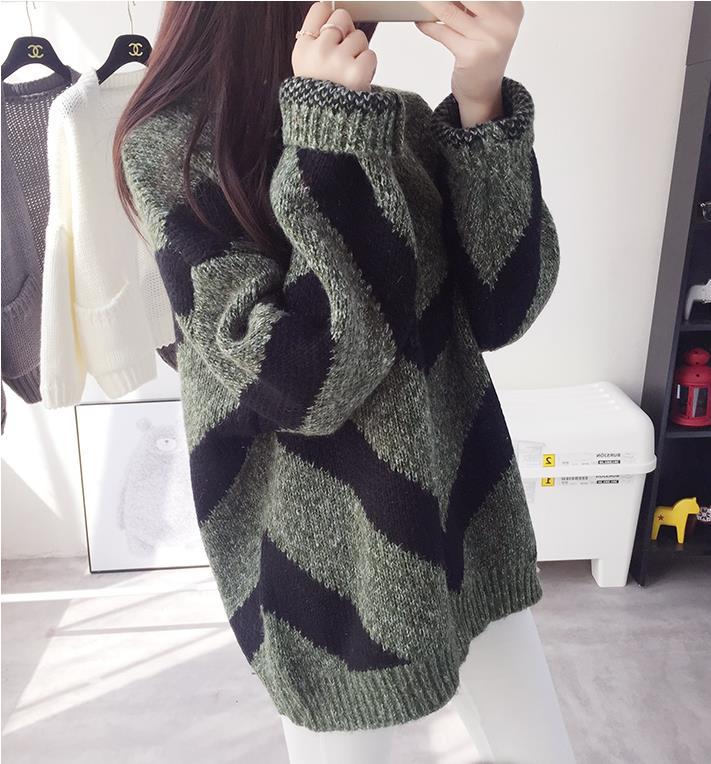 2015毛衣外套女 新款條紋波浪拼色韓版潮針織衫冬季寬松套頭 /