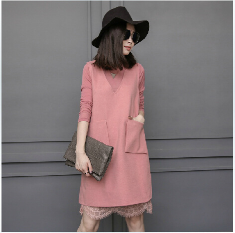 歐洲站秋裝歐貨蕾絲打底衫兩件套時(shí)尚長袖秋冬毛呢連衣裙女潮 /