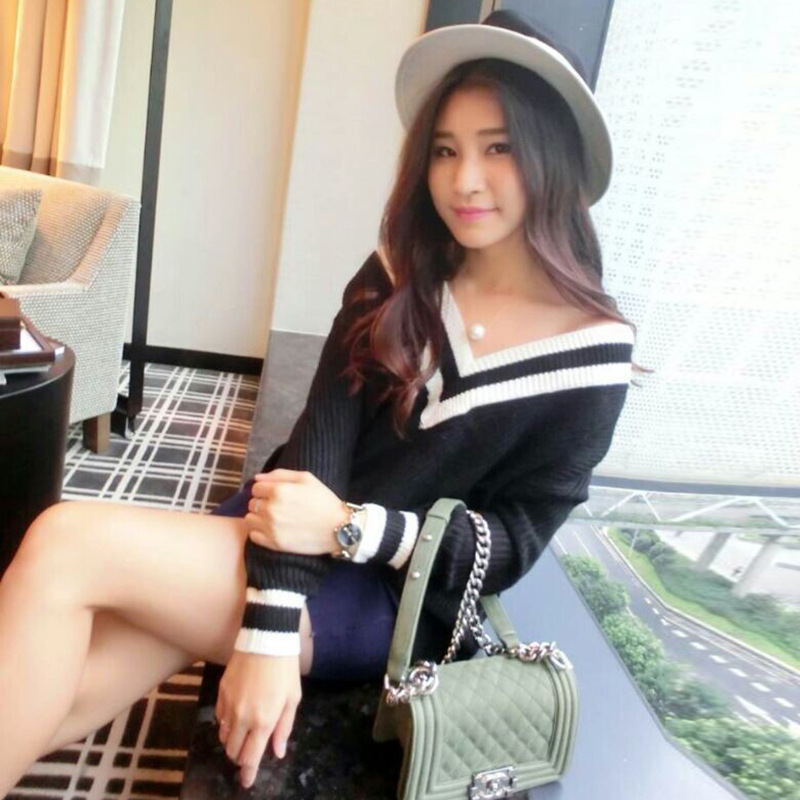 初秋季2015時(shí)尚新款V領(lǐng)條紋針織衫寬松女式毛衫 /