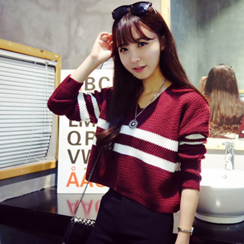 韓國(guó)代購(gòu)女裝毛衣V領(lǐng)長(zhǎng)袖短款女式條紋長(zhǎng)袖針織衫女 批發(fā) /
