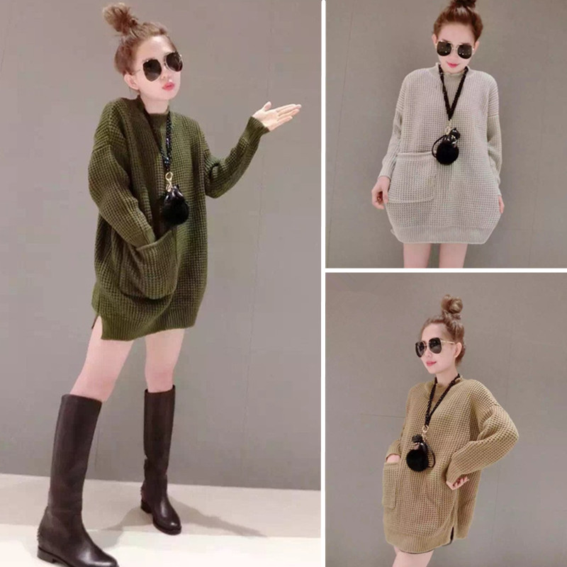 歐洲站2015秋冬新款歐美寬松大碼圓領(lǐng)中長款大口袋套頭針織毛衣 /