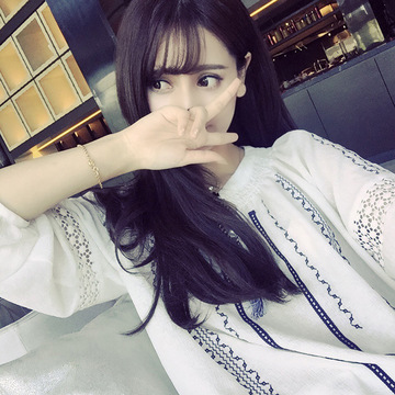 韓系甜美七分袖鏤空民族風(fēng)刺繡娃娃衫襯衫女 /