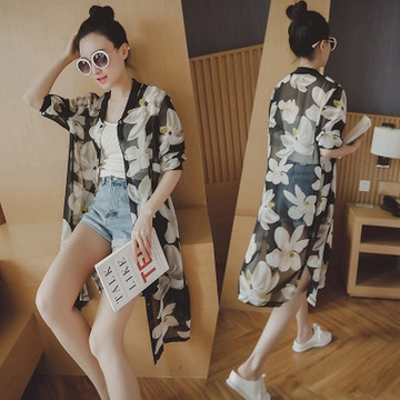 2016夏季新款韓版中長款薄款花朵印花雪紡防曬衣風(fēng)衣外套 /