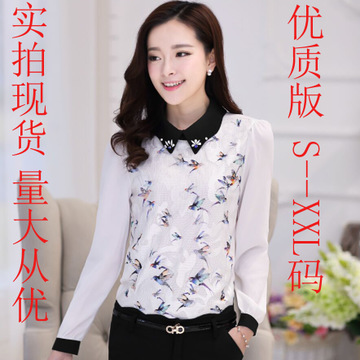 襯衫領長袖雪紡衫潮年春裝新款韓版休閑大碼女裝蕾絲打底衫 /