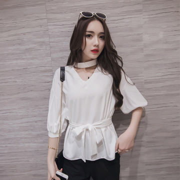 實拍夏季新款韓國優(yōu)雅系時尚領口鏤空桃心純色寬松系帶通勤襯衫潮 /