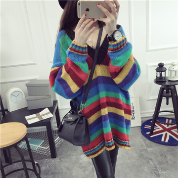 針織衫毛衣女彩色條紋打底衫韓國(guó)東大門春裝韓版2016春裝新款 /