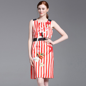 2016春夏新款歐美走秀款人物刺繡花紅色豎條紋無袖背心連衣裙女 /